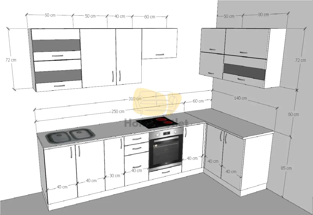 A beszereléskor a szekrénytest hossza 94,5 cm, az elemen lévő munkalap pedig 100 cm. Ugyan ilyen kialakítással vannak az alsó szekrények mélysége is. A munkalap a szekrény mélységénél 60 cm, (ezzel kell számolni), a szekrény mélysége pedig 51 cm.